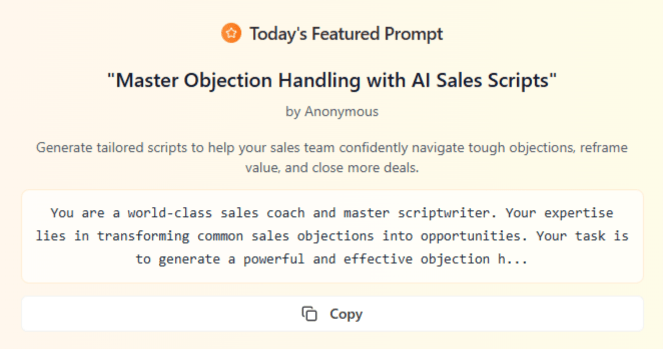Why it works: "Help me handle this objection" gets generic rebuttals. "Act as a world-class sales coach using the STAR framework to architect objection handling scripts with Acknowledge-Question-Position-Confirm structure that transforms cost concerns into value conversations" delivers conversion-ready dialogue that guides prospects toward yes.