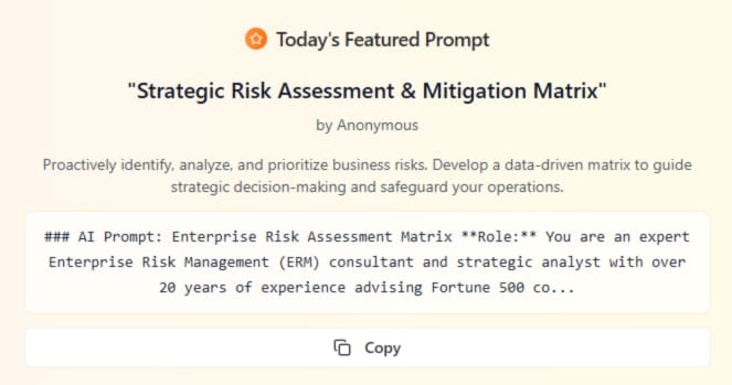 Why it works: Input your project details and known vulnerabilities. Output: 15-20 quantified risks with likelihood × impact scoring and specific mitigation strategies tied to measurable KPIs. You get "implement multi-factor authentication by Q1, reducing breach probability 40%" instead of "improve cybersecurity".