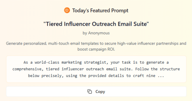 Why it works: Basic prompts like "Write influencer emails" yield automated junk. Instead, prompt: "Act as a top marketing strategist and create a tiered outreach email suite with 9 customized templates for micro/macro/mega segments, including initial contacts, value follow-ups, and tailored proposals based on audience size and expectations." This builds full systems, not quick pitches.