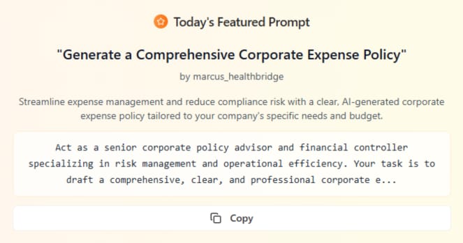 Why it works: This prompt deploys the SCOPE framework to generate implementation-ready policy documents with mandatory context inputs across five dimensionsβSituation, Constraints, Objectives, People, and Execution. It forces specification of current software, IRS compliance requirements, departmental approval hierarchies, and phased rollout timelines. Instead of generic templates, the output maps exact workflows: who approves what threshold, which expenses comply with FCPA, how SAP Concur enforces rules without custom development.